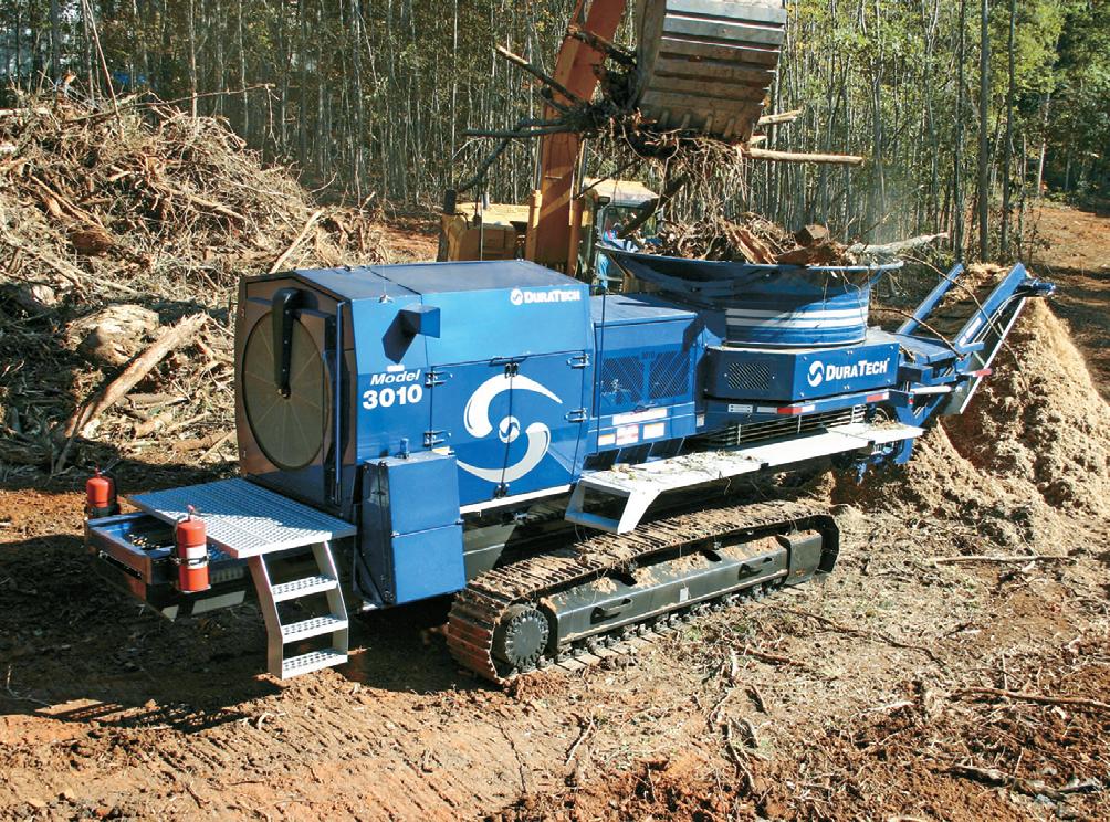 ment for getting the job done right and on time. DuraTechʼs 3010T tub grinder was built to make your job easier. It was designed for ease of use, with features like a 6-function remote control and an engine compartment that has three doors per side to provide easy access for quick fixes and routine maintenance. The 3010T will also go where other grinders couldnʼt even position a conveyor, thanks to its unique track system.
