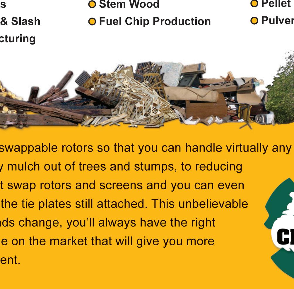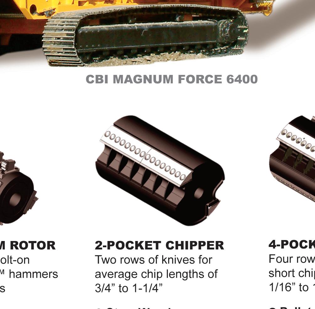 Who knows where the future of biomass contracting lies? Not us, and not CBI. Thatʼs why theyʼve made the Magnum Force 6400 to be what they call the worldʼ s most versatile grinder. With four different, field-swappable rotors (forged drum rotor; solid steel rotor; and two application specific drum chipper rotors), in a single day you can go from making mulch from trees and stumps, to chipping stem wood into 2-30 mm fiber length, to grinding highly contaminated C&D or railroad ties with the tie plates attached.