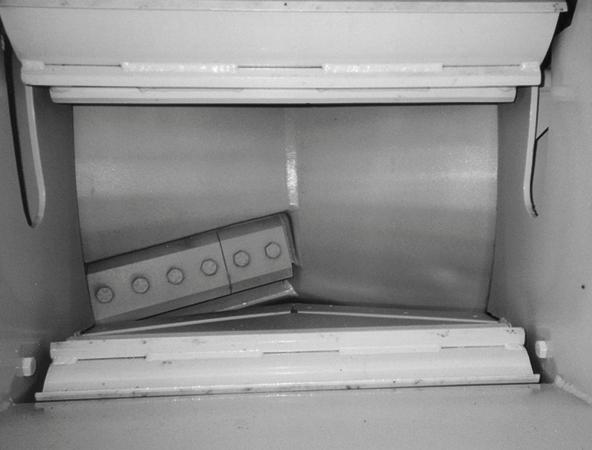 The Rawlings E4600 is protected by an Anvil Swing Away feature that allows metal and other damaging objects to drop through onto the out feed conveyor before entering the grinding chamber. When shear pins are sheared a protection circuit shuts down hog and conveyor to protect the machine.