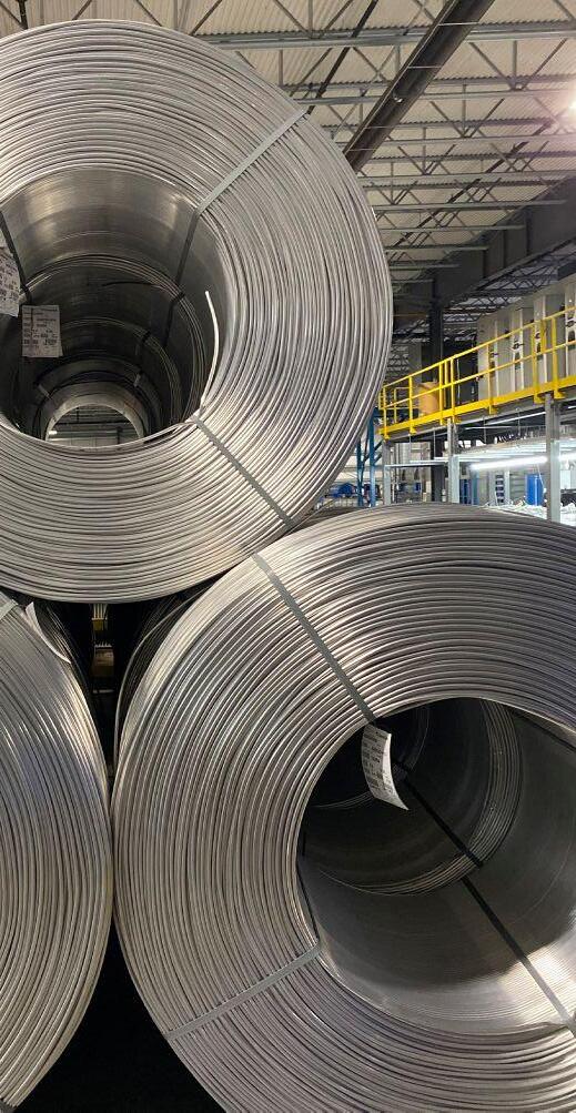 This 8000 series conductor-grade aluminum rod (99.5% pure aluminum, 0.5% alloy) was produced in Canada with clean hydroelectricity. Once drawn into various input wire sizes, it will be stranded into different conductor types.