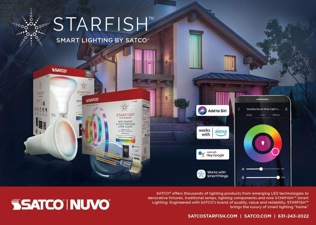 Satco’s Starfish smart lighting line-up is enabled through a Wi-Fi network, and integrates with Alexa, Hey Google, Siri and SmartThings for smart home applications. The line-up offers a variety of products, from general service bulbs that fit standard fixtures to downlights and decorative products, such as colour-changing tape lights and string lights (satcostarfish.com).