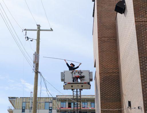 A Power Line Technician apprentice works to install a component of the electrical training prop for Ottawa Fire Services.