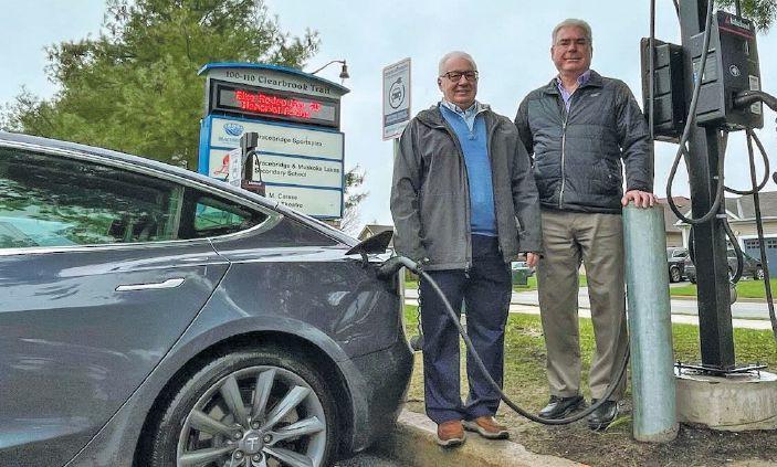 Lakeland CEO Chris Litschko and Bracebridge mayor Rick Maloney unveil one of the town’s five new electric vehicle charging stations.