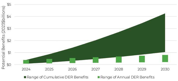 The potential gross distribution-level avoided costs realized by fully enabling DERs in Ontario range from $200 million (achievable potential) to $800 million (economic potential) annually by 2030 given the 2024 IESO annual planning outlook forecast.