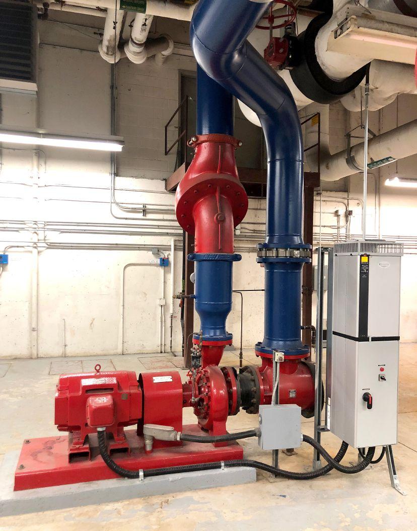 A variable frequency drive on a pump in the boiler room at Enercare Centre.