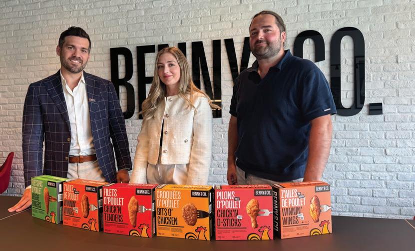 De gauche à droite : Vincent Samuel Cabana, directeur – Achats et commerce de détail ; Elisabeth Benny, vice-présidente – Marketing et Relations publiques ; Marc-Antoine Benny, vice-président –Achats. Devant eux : les boites des produits congelés commercialisés depuis peu par Benny&Co.