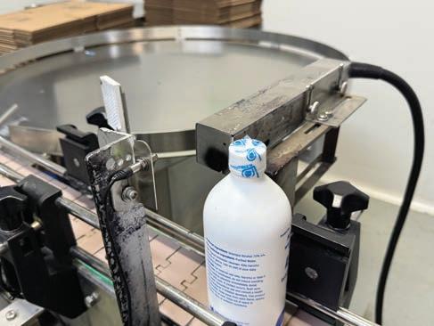 Une bouteille sur laquelle un sceau de sureté a été apposé se dirige vers la zone de marquage qui sera assuré par une imprimante de marque Leibinger.