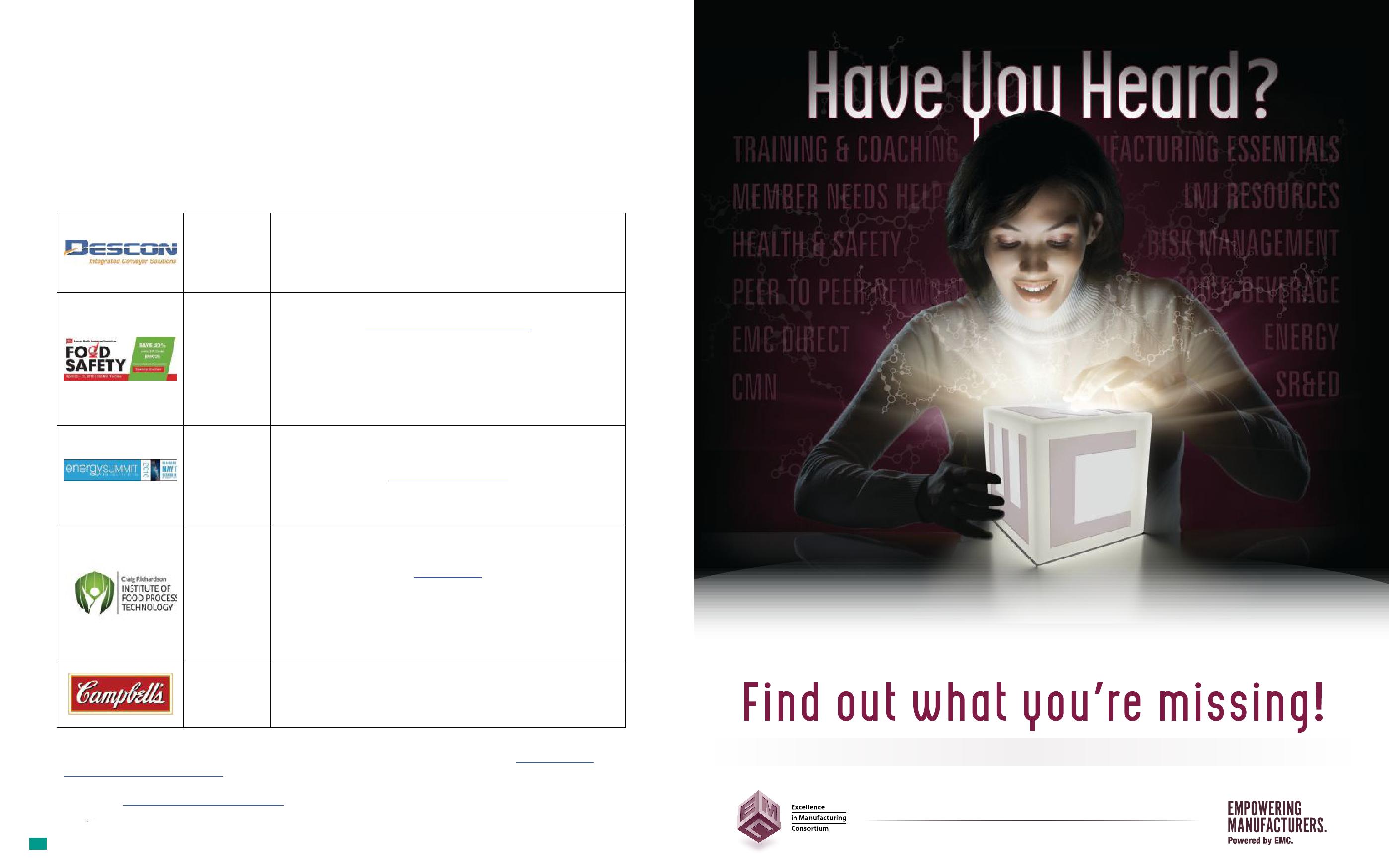 and sourcing programs to keep you poised and ready to be competitive the year through. With a combined collective work experience of 217 years, our team is ready to assist manufacturers as best we can. Sharing best practices and providing plant tours are among the ways we transfer knowledge. With all things food, beverage, bio and ag processing in mind, we invite you to take part in our 2016 GF2 EMC Food Sector Networking Events. Upcoming sessions are listed below together with two excellent summit opportunities. A Food Sector Calendar is also available on the EMC Website (www. emccanada.org), which has the latest in event information.