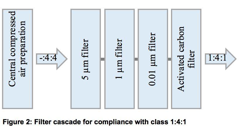 For compressed air that comes into contact with wet food, such as meat, fish or vegetables, it’s widely held that ISO 8573-1:2010 Class 1:4:1 should apply, and for dry foods like cereal or milk powder, Class 1:2:1. That’s what Festo, a leading