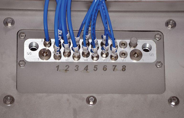 High reliability despite hydrogen peroxide: A corner strip with an all-round seal prevents the valves from coming into direct contact with H2O2 -impregnated air in a standard valve system. The valve outlets exit the machine.