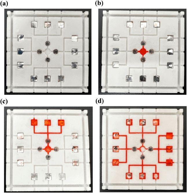 Initial picture of the detection platform with the detection chip placed in the sensing area. (b) All four shut-valves are in operation, adding liquid to the liquid addition port. (c) Close one of the shut-valves and the liquid flows toward the sensing area. (d) Close all shut-valves and fluid flows to the perimeter sensing area.