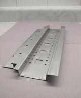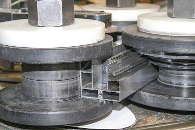 extrusion is pulled as it exits the cooling bath, fitted into the aluminum, steel or plastic retainer and cut to length by the workers.
