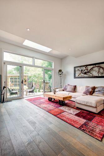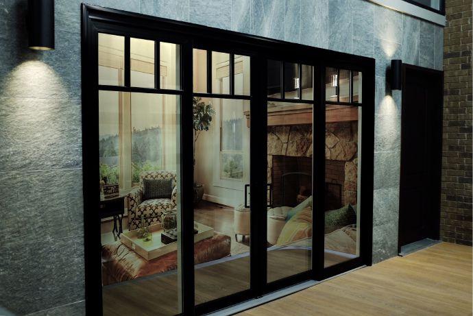 wall of the showroom is a 16-foot-wide bi-parting door, finished with sleek black frames and a low-profile sill. This sliding glass door showcases what an addition of a large open passage can do to for a transitional space.