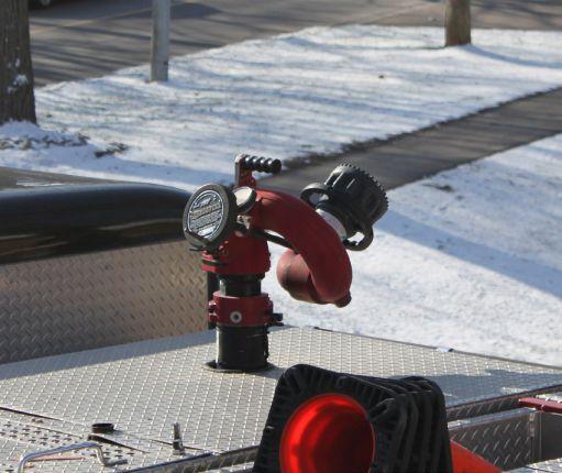 Photo 1: The initial blitz attack will often involve a fixed masterstream device attached to the top of the apparatus to accomplish a rapid knock down.