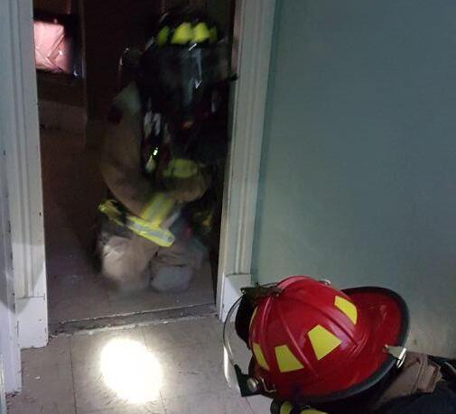 In Photo 1, you will see a firefighter staged with the nozzle in their hands while the other team member is in front of them. This is where/ how the search is conducted having a hose line. The lead firefighter stays in a central position near a wall or by the doorway of a room, while the other firefighter leaves the hose line and searches the immediate area. The search firefighter is maintaining building orientation in two ways: by keeping themselves on the wall when they leave the hose line and also by verbal or line of sight with the lead firefighter on the hose line.