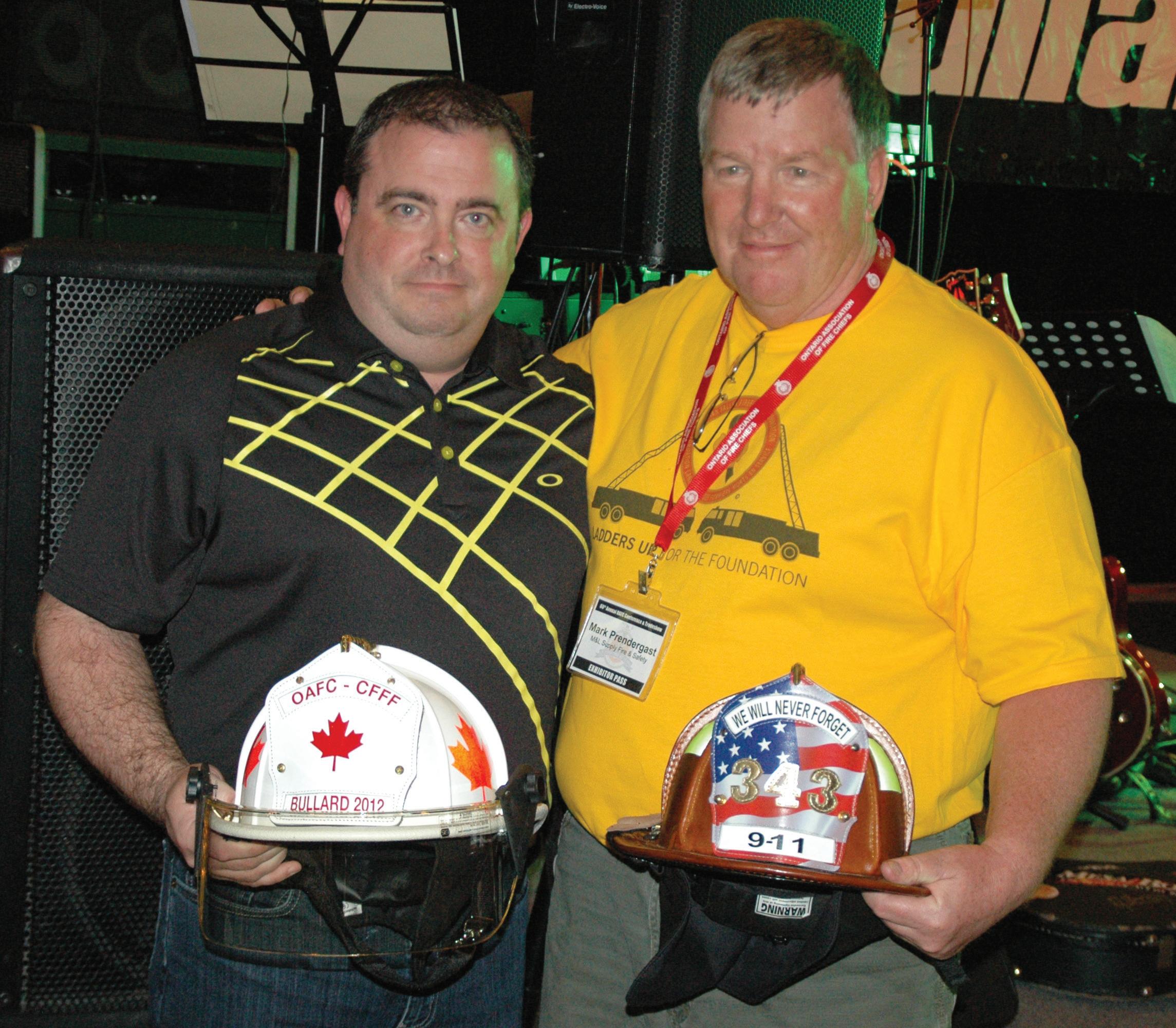 LEFT: Troy Mulch, vice-president of the Canadian Volunteer Fire Services Association and the winning bidder on the commemorative OAFC-CFFF helmet at Ladders Up, and Ladders Up founder Mark Prendergast, president of M&L Supply, with the 9-11 helmet that he bought at Stop, Drop, Rock & Roll in 2011 in Indianapolis.