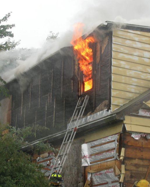 Photo 1: Burned building with three different ground ladders staged under three windows.
