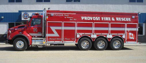MD of Provost Fire and Rescue in Alberta, under Fire Chief Barry Johnstone, took delivery in April of a Rocky Mountain Phoenix/Rosenbauer-built tanker. Built on a Kenworth T880 chassis and powered by a 600-hp Cummins ISX 15-litre engine and an Allison 4500 EVS transmission, the unit features a 4,000lpm Rosenbauer pump, a Rosenbauer Fix Mix and FoamPro 1600 systems, 4,800-gallon water tank and 30-gallon foam tank, a TFT Tornado bumper turret and Evolution brow light.