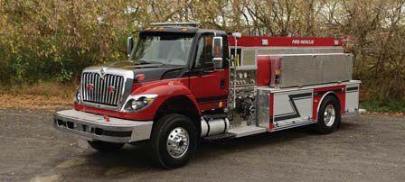 This unit was built on an International 7600 chassis, and is powered by a 410-hp MaxxForce engine and an Allison 4000 transmission. It features an 835-igpm Hale pump, a 2,450-imperial-gallon water tank, an internal ladder, Porta-Tank storage, and a Federal siren.