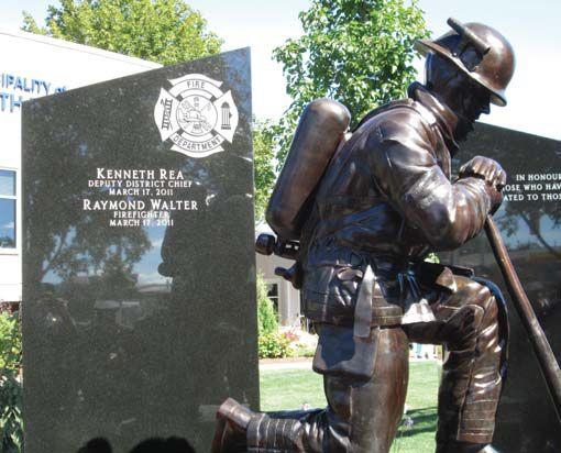 The monument, which cost about $80,000, was funded primarily through donations from residents and businesses. It features a bronze, life-sized statue of a firefighter in full gear. Behind the statue are two black granite slabs, one bearing the names and ranks of Walter and Rea, the other, an inscription: “In honour of those who have fallen, dedicated to those who serve.”