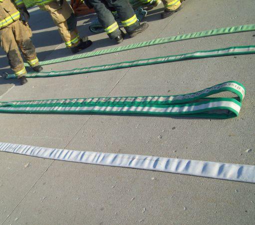If 30 metres (100 feet) are needed, then two bundles are taken. If 45 metres (150 feet) are needed, then three bundles are taken. The three bundles are packaged such that, when they are laid side by side, the couplings can easily be attached; this allows for easier staging of the equipment and personnel, while enabling firefighters to prepare for the operation once they are at the floor below the fire floor. With the couplings laid out side by side as shown on photo 2, a single firefighter can make the connections among the three bundles.