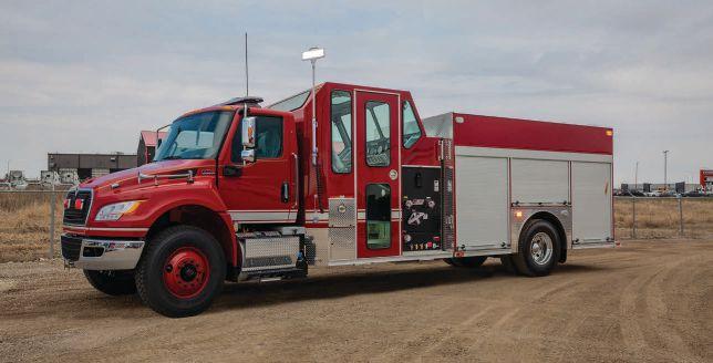 Delivered by Fort Garry Fire Trucks, this MXV Wildland fire truck was built on an International HV 507 chassis and has a 350 HP Cummins L9 engine paired with an Allison 3000 EVS transmission. The black-coated aluminum pump panel features a Darley PSP1250 pump and a co-poly 1000 IG water tank.