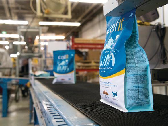 After extrusion, the preservative-free kibbles are sent to a single pass dryer (to add shelf life), sifted and enrobed in flavours. Once cooled, they are bagged in recyclable packaging—a first for Hagen—on one of the company’s eight fully and semi-automatic packaging lines.
