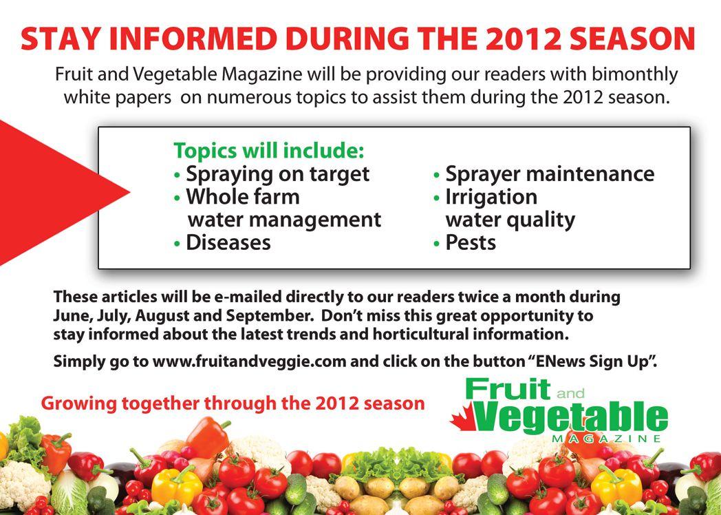 July 12-14, 2012 – Canadian Fruit & Vegetable Tech X-Change, 1195 Front Rd., St. Williams, Ont. Visit www. fruitvegtechxchange.com.