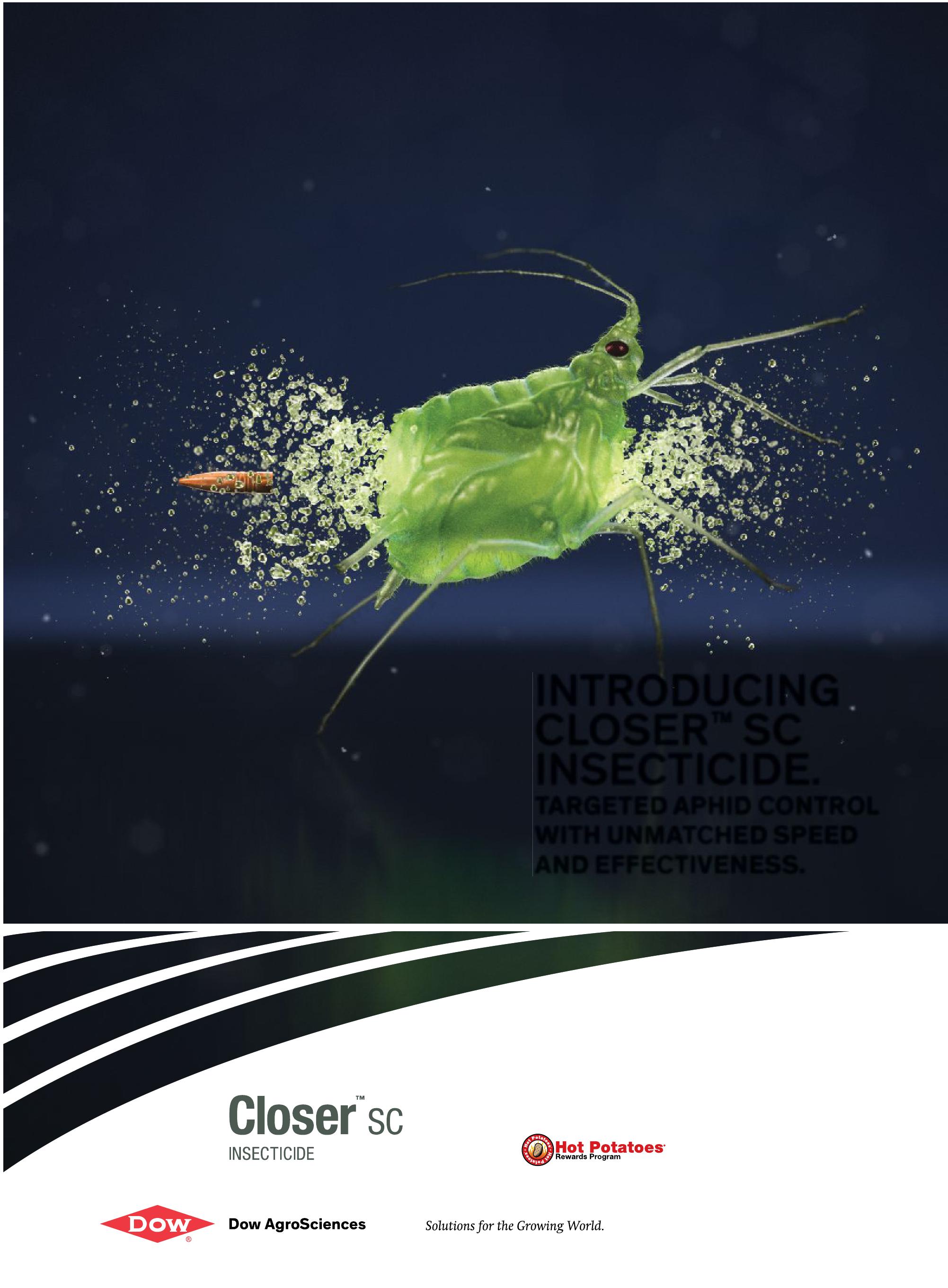 “Seed potato growers have to be absolutely diligent about controlling aphid populations,” says Jerry Olechowski, marketing manager with Dow AgroSciences, maker of the insecticide. “This novel mode of action provides super-fast knockdown of insect pests. Closer exhibits complex and unique interactions with important