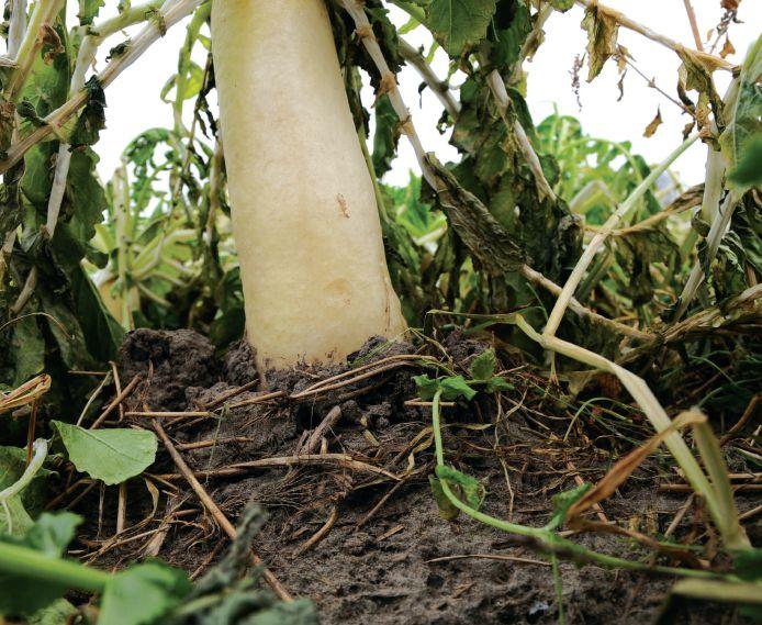 “They are heavy nitrogen feeders as well, and so if you’re following an earlyharvested crop like peas where there is still some nitrogen, or you’re adding some nitrogen through manure, you will get massive radishes,” she observes. “A one-year return should not be aimed for in terms of boosted yield for the crop that follows, as some of the N released by the radishes goes to feeding the soil.”