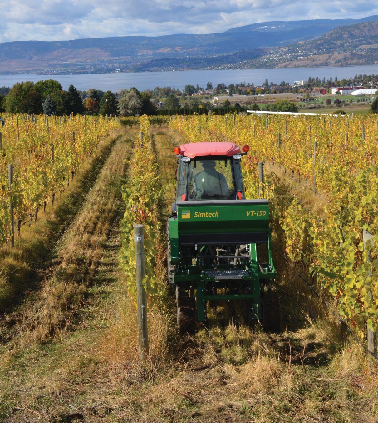 spring, and early summer. A no-till seed drill is used and, while most Okanagan vineyards have overhead irrigation as well as drip, Covert gets by with just their drip system. “We are essentially dry-farming our alleyways,” he says. “We know that a mix of plantings is better for dry conditions, and a mix also provides a balance between soil bacterial and fungal development.” Winter peas, lentils, triticale, daikon radish and hairy vetch go into the alleyways in the fall and are terminated in early summer before they seed out. June is usually rainy in the Okanagan, so Covert says it’s a good time to reseed with warm season legumes
