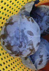Cabbage – Alternaria leaf spot can cause losses from spotting lesions on the heads of cabbage, reducing yields and increasing the number of unmarketable heads. Symptoms appear first on the older leaves as small, yellowish lesions that expand to resemble a target with concentric light and dark areas. Alternaria leaf spot can quickly spread from the leaves to the heads, with the lesions ranging in size from pinpoint to several centimetres in width.