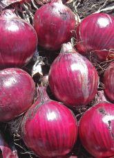 Matures 115 days; flat globe red onion; stores 4-6 months; dark red interior and exterior colour; some tolerance to bolting, pink rot. Courtesy of Stokes Seeds