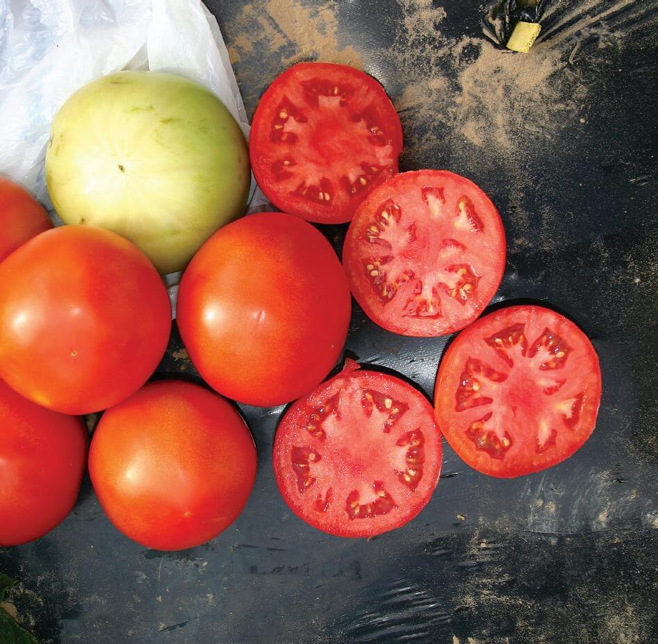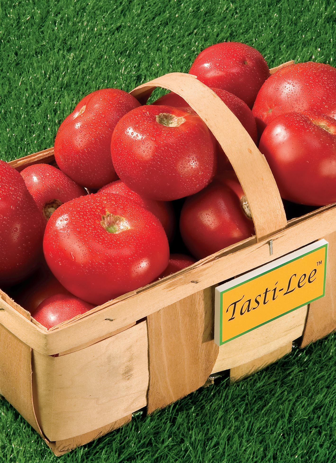 tasti Lee is a round red hybrid created for the fresh market; high level of lycopene; rich red inside and out; remains firm at maturity; medium plant. Matures in 64 days.