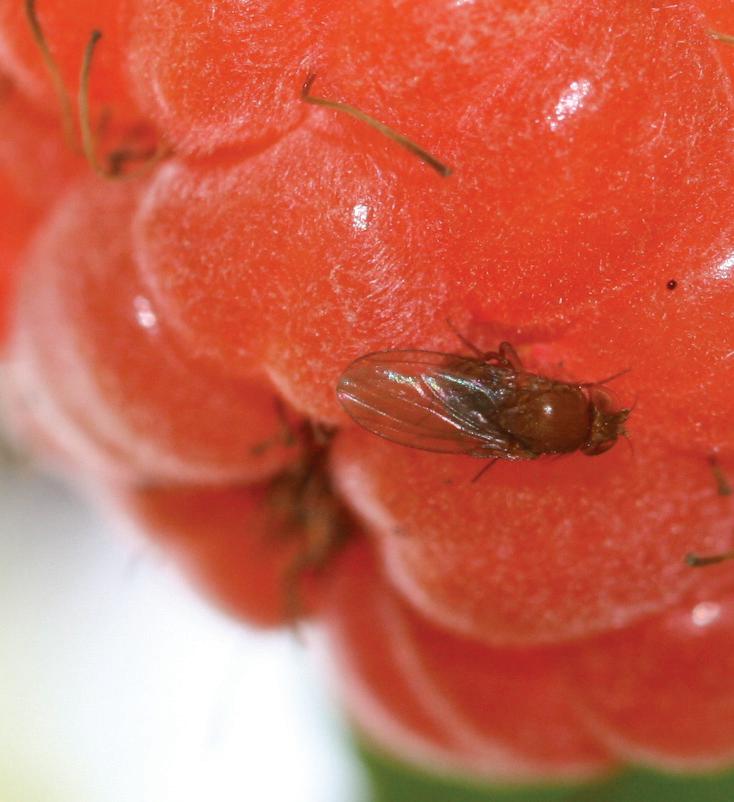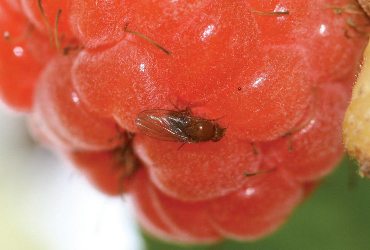 Female spotted wing drosophila on raspberry at the Upper Mountain Research Station in North Carolina.