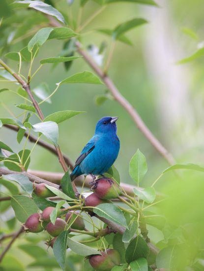 An indigo bunting on Flemish Beauty pears.