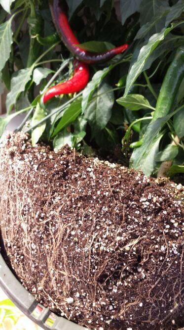 Photo 4 is another example of a pepper basket that is rootbound. Because such plants dry out much faster it results in a generative response. The peppers started turning colour (to red from green) very quickly.