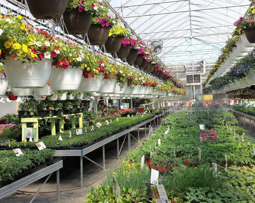 Growing media and container sizes: Photo 1 shows what is typical in a bedding plants greenhouses in May. The container sizes vary from small plugs to 12" –14" hanging baskets. Although they are being grown in the same greenhouse, one can see distinct shade in the middle and under the baskets.