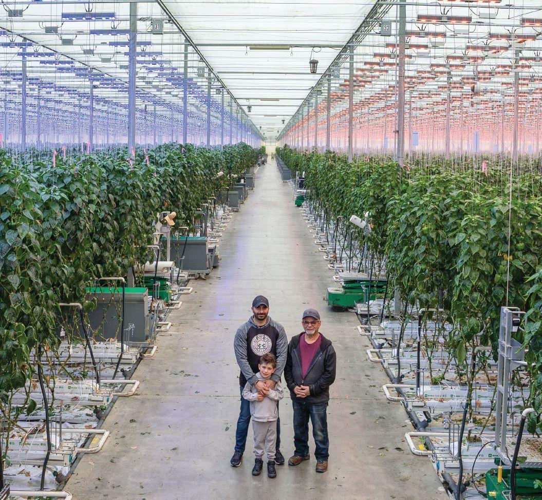 Gene Ingratta, a third-generation grower, poses with his son, Maverick, and his father, Nick Ingratta, among some of the many pepper plants growing at Allegro Acres.