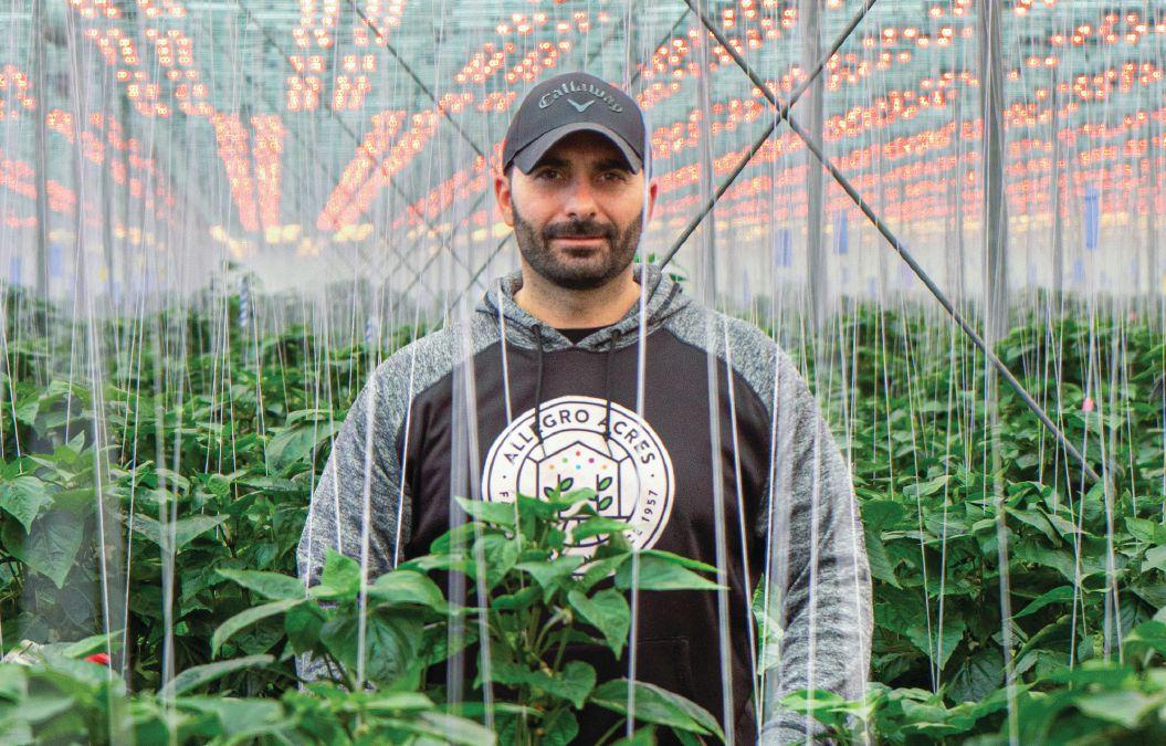 Gene Ingratta converted Allegro Acres to growing solely bell peppers yearround. It is the first Canadian greenhouse operation to grow bell peppers commercially in the winter using LED technology.