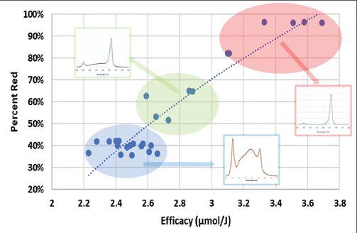Relationship between appearance colour (represented by % R) and efficacy of modern horticultural LEDs, taken from the Design Lights Consortium’s list of horticultural qualified products (DLC-Hort QPL) in November 2021. Inset graphics are representative of the typical spectral distributions of the products contained within each sub-grouping.