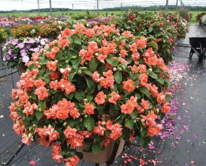 Impatiens Beacon White (32) and Impatiens Walleriana Imara Orange Star (33) are two colours from the Beacon and Imara series, long awaited to replace older impatiens genetics. In our trials, the Beacon and the Imara did very well all summer long without any signs of impatiens downy mildew (IDM) and with good garden performance. The double impatiens, such as Impatiens Double Fiesta Coral Orange (34),