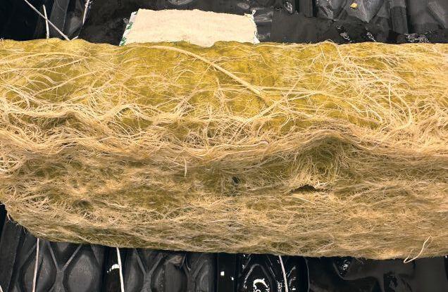 Healthy cannabis root mat formed at the bottom of a rockwool slab.
