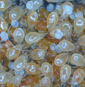 Supplemental foods include Ephestia eggs, prey mites (used in breeder sachets), and pollen (e.g. Nutrimite), but one of the newest and most intriguing supplements are decapsulated Artemia cysts. Several research studies support the potential use of Artemia cysts as a supplement to enhance the establishment and activity of predatory species (insects and mites) in greenhouse crops or as a food source for mass-rearing such species. Biobee has built on these findings to develop commercial products for a range of generalists. Artemia cysts are very nutrient-rich and boost fecundity and longevity. They also have some logistical advantages over the other types of supplemental food in that they can persist in the crop for several weeks, and can be stored in a refrigerator for at least three years. This stability means that their quality is maintained even if there are breaks in the cold chain during distribution and during use.