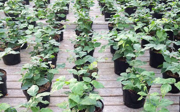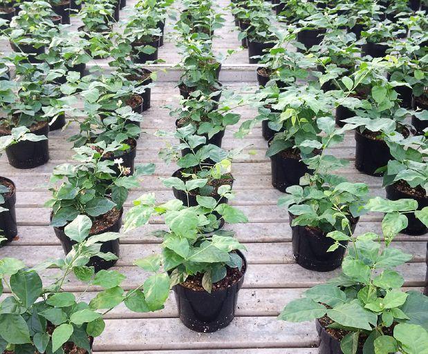 ABOVE Potted jasmine sambac plants in the greenhouse.