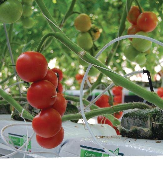 When irrigation commences during low plant activity or before transpiration occurs, a phenomenon known as “active root uptake” will increase water uptake. Most growers refer to this as “root pressure”. Carrier proteins are necessary to move ions such as K+ and Ca2+ from the surrounding substrate into the roots through a single layer of cells. Energy formed during photosynthesis, helps to move those ions into the root, and is converted into a concentrated ion solution within the root cell. The water follows the ions as it moves into the root cell, through a passive process called osmosis, resulting in increased pressure. Therefore, growers should not have a pronounced irrigation EC reduction based on light intensity (W/m2), and should stop irrigation before sunset. This action will ensure that electrical conductivity (EC) is not at its lowest when transpiration stops, and enables the grower to achieve a higher substrate EC going into the night, decreasing the potential for cracking and splitting of tomatoes.