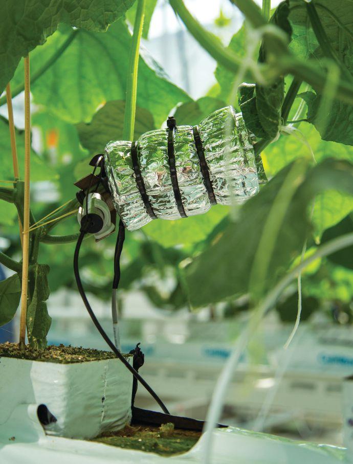 The extra sensors, notes Tran, include infrared sensors to determine plant temperature. “Research shows that the ambient air temperature and plant temperature can be very different, and plant temperature is a much better predictor of plant response,” he says. “When we combine those readings in our model with net radiometer readings and hundreds of other elements, we can get a very accurate determination of transpiration and photosynthesis rates.” A few additional temperature and humidity sensors were also added near the top of the greenhouse to determine differences in these parameters between the plant growing area and above it.