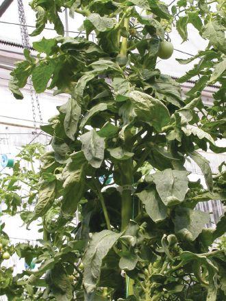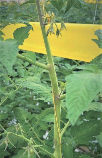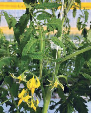 Picture 3 (P. 30, left) shows a thick stem, big flowers and leaves coming out of the cluster. It appears that the symmetry is lost. The flowers are pale yellow with thick calyx. Any fruit set on these clusters will show “catfacing” at the blossom end due to poor pollination. This is a very vegetative signal from the plant.