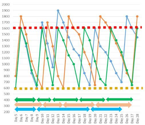was 1600 g. They failed to hit the dry and wet targets in the orange and blue curves. Bottom arrows show the number of days between irrigations. By staying within the wet-dry targets, the “green” grower irrigated his crop five times while the “orange” grower irrigated four. The “blue” grower is considered a wet grower – irrigating only three times due to exceeding the wet target and failing to hit the dry target.