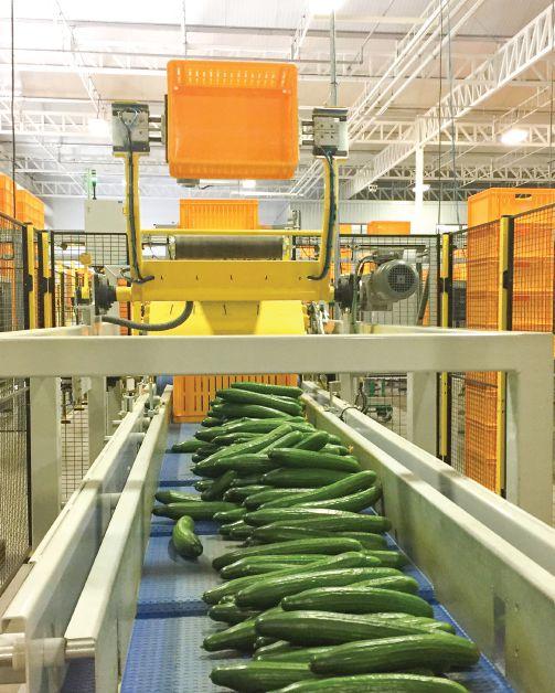 delivered to the pack lines via induction wire by a driverless M-Track or Bumble Bee train,” explains Guy Totaro, grower manager of cucumbers at Mucci Farms. “The system scans the tag on the carts to identify the product when it’s being offloaded and then sorts it for the appropriate pack line. Our team then grades and packs it and our automatic palletizer uses infrared technology to determine the pallet configuration.”